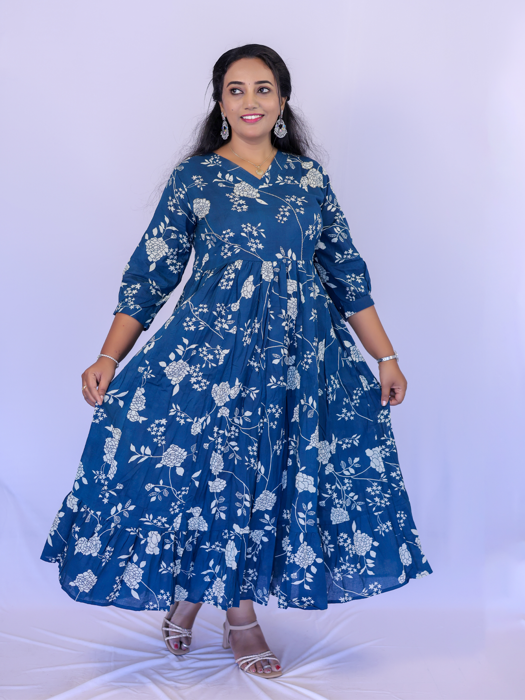 46” Length Frock in Heavy Cotton Fabric. It Offers a Very Good Flow Over the Body Due to Its Weight. Features Slight Embroidery Near the Yoke Portion.